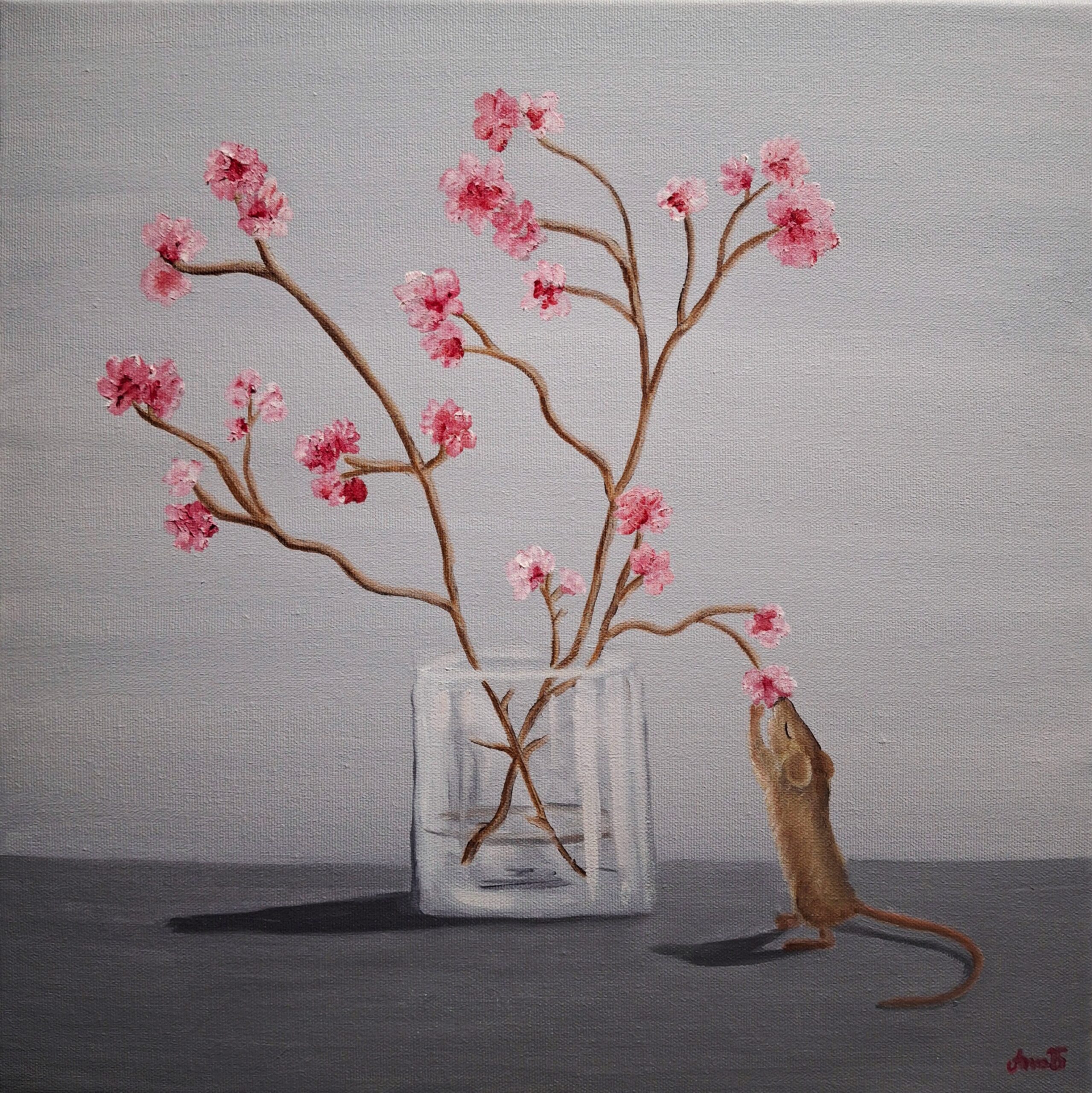 Alkuperäisteos: Hiiri ja kirsikankukat, öljymaalaus, 40x40x2cm